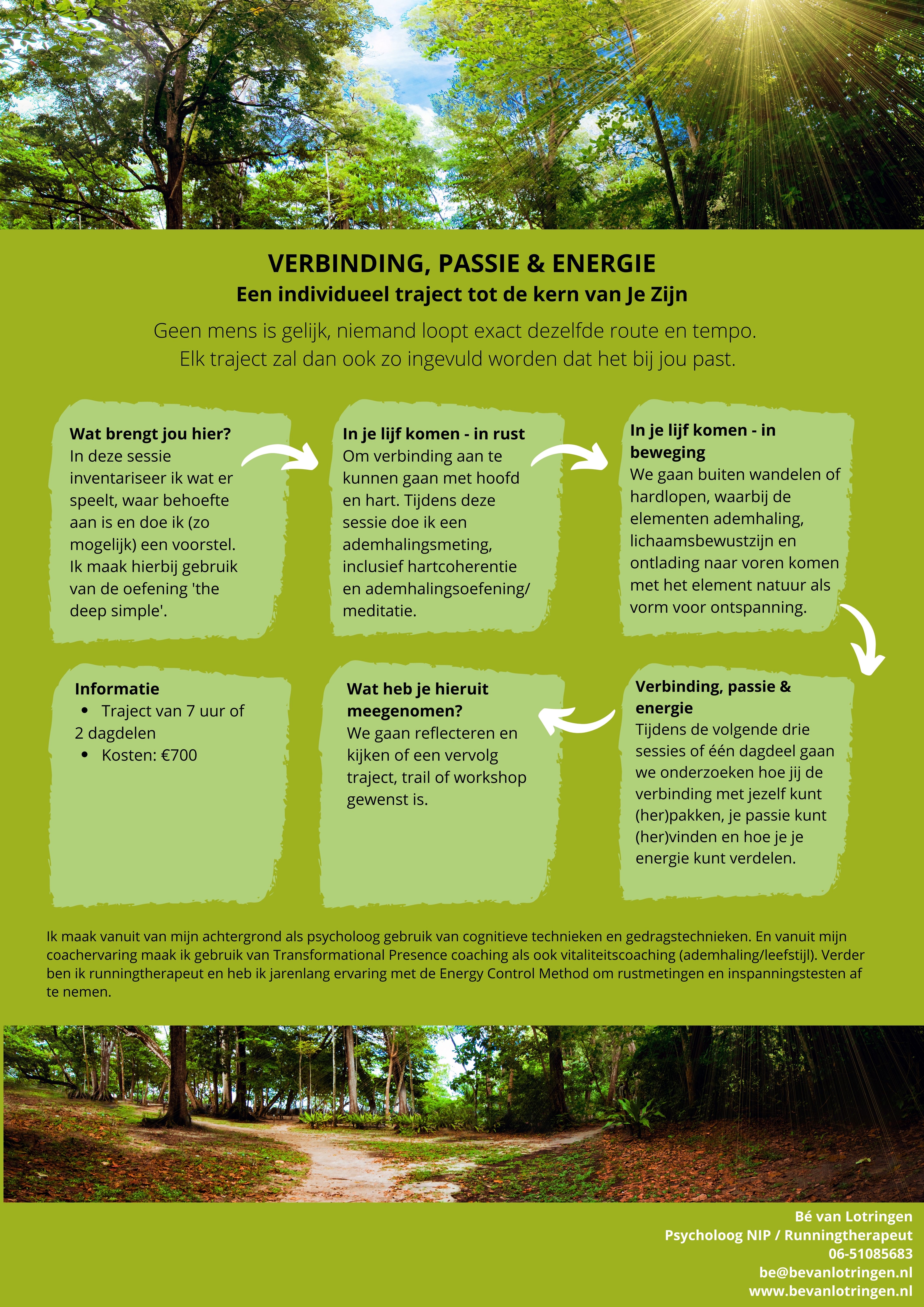 Voor wie het gevoel heeft dat er meer uit het leven te halen valt, bied ik coaching trajecten zoals: in 7 stappen naar VERBINDING, PASSIE EN ENERGIE , de intensievere BOOST! , of het BE CURIOUS traject. Heb je een ontwikkelvraag of wil je hulp bij levensvragen, dan maak ik een persoonlijk stappenplan, samen met jou. Hierbij maak ik zoveel mogelijk gebruik van gesprek, beweging en ademhaling. Deze combinatie is essentieel voor jouw basiswelzijn. Soms heb je maar enkele sessies nodig om weer verder te kunnen, soms wil je dat je op structurele basis een spiegel voorgehouden krijgt.